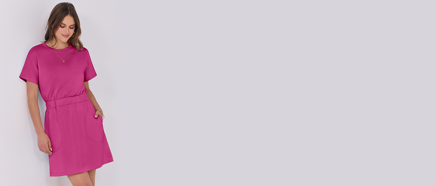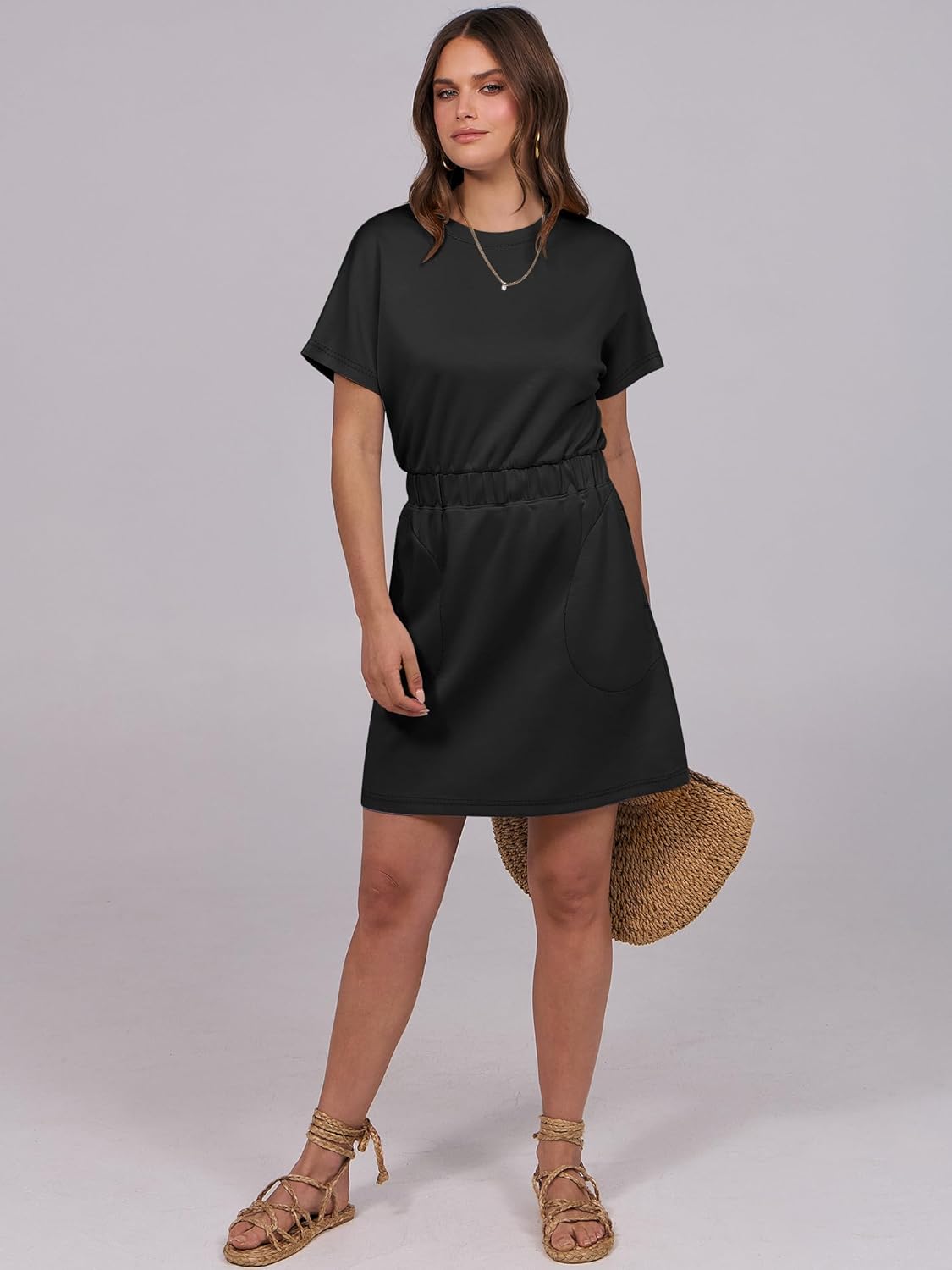Womens Casual Short Sleeve Crew Neck Elastic Waist Mini T Shirt Dress with PocketsWomens Casual Short Sleeve Crew Neck Elastic Waist Mini T Shirt Dress with Pockets