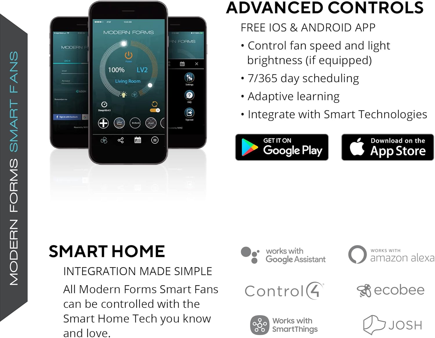 Free app download: Sync with our exclusive Modern Forms app to control fan speed, use smart features like breeze mode, adaptive learning, create groups, and reduce energy costs. New: Bluetooth compatible for improved range and an unlimited amount of fans can be controlled with remote or wall control within range.