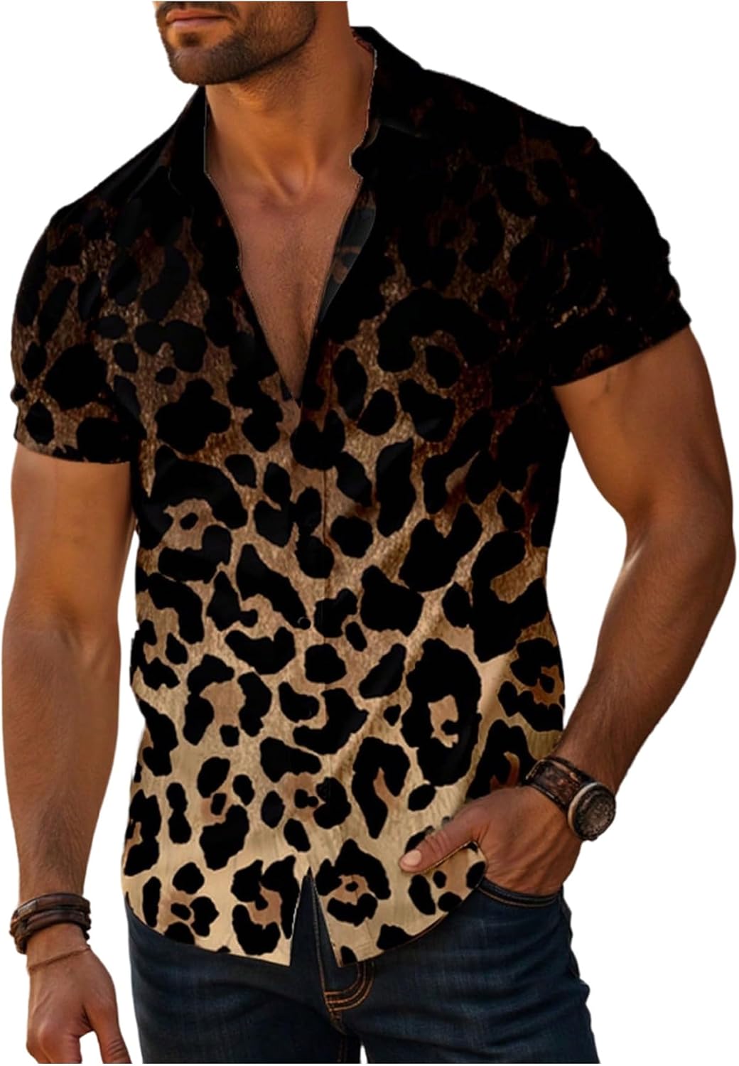 Verdusa Men’s Leopard Print Button Down Shirt Short Sleeve Collar V Neck Casual Shirts