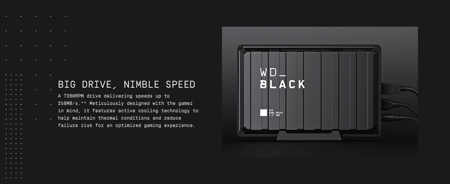 The wd_black D10 game Drive will take your console or PC to the next level and help you keep the competitive edge you need to win. Add up to 8TB of extra storage to your device to build up your game library up to 200 games, or Relive your best in-action moments by saving your favorite game play recordings. Rated at 7200 RPM with Active cooling technology, wd_black D10 game Drive has speeds up to 250MB/s to kick your game into high-performance mode so you can play without limits and drive your game The way you choose. | Number of games based on a 36GB average per game. The number of games will vary based on File size, formatting, other programs, and factors. Based on read speed and internal testing. As used for transfer rate, megabyte per second (MB/s) = one million bytes per second. Performance will vary depending on your hardware and software components and configurations.