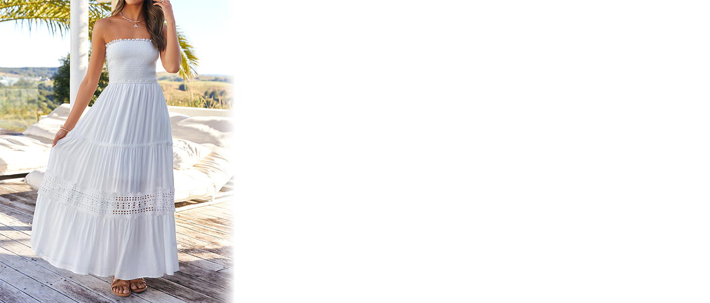 Feature — Lace trim detail at hemline/Off shoulder style, no straps, smocked bodice, high waist, tiered skirt, maxi length, tube dress.